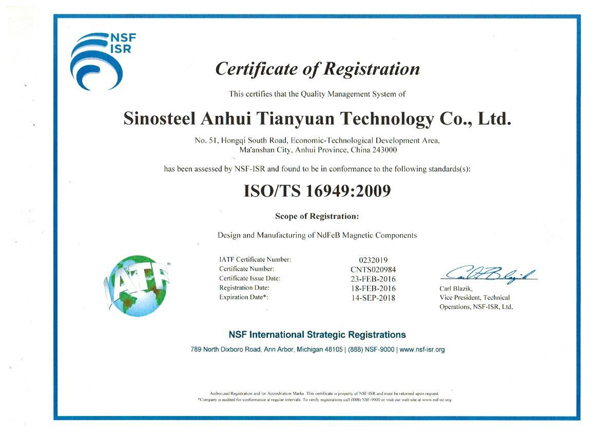 2015年12月,NSF-ISR认证公司的审核专家组对钕铁硼厂ISO/TS16949:2009质量管理体系进行了现场审核,审核专家一行2人一致认为,钕铁硼厂的质量管理体系是充分、适宜和有效的,并推荐予以认证。2016年2月23日钕铁硼厂正式取得ISO/TS16949:2009质量管理体系的认证证书,为钕铁硼厂开拓新能源汽车市场提供了基础。