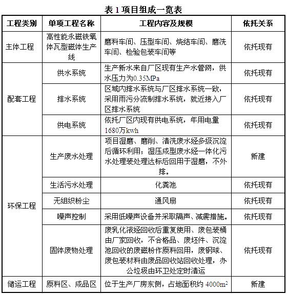 年产6000吨高性能永磁铁氧体器件项目位于现有二期高性能永磁铁氧体瓦型磁体生产线内,该项目组成主要包括主体工程、配套工程(供水系统、排水系统、管网、供电)、环保工程等,实际建设工程情况内容见表1。