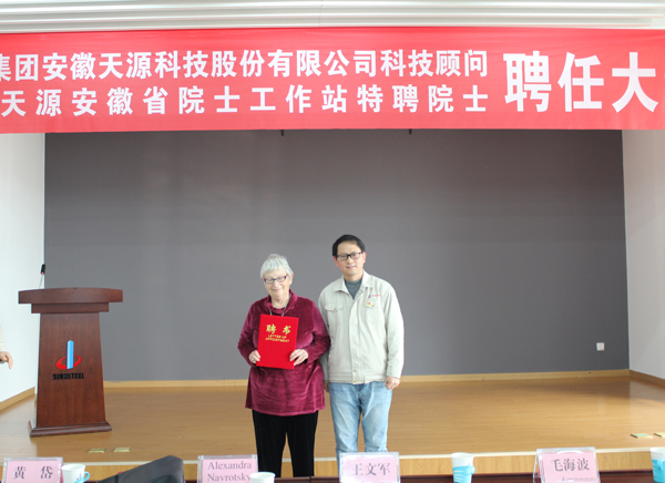 毛海波总经理在会上介绍了Alexandra Navrotsky的简况。随后公司董事长、党委书记王文军与副总工程师裴晓东分别为Alexandra Navrotsky颁发了凯时娱人生就是博科技顾问、院士工作站特聘院士的聘书。聘任仪式结束后, Alexandra Navrotsky为参会人员作了主题为“A Career in Thermodynamics , Geochemitry and materials science”(热力学、地球化学和材料科学领域的研究概况)的学术讲座。