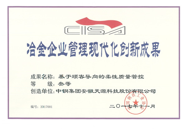 据悉,2017年冶金企业管理现代化创新成果评选结果日前揭晓,凯时娱人生就是博本部申报的管理创新成果《基于顾客导向的柔性质量管控》荣获三等奖。